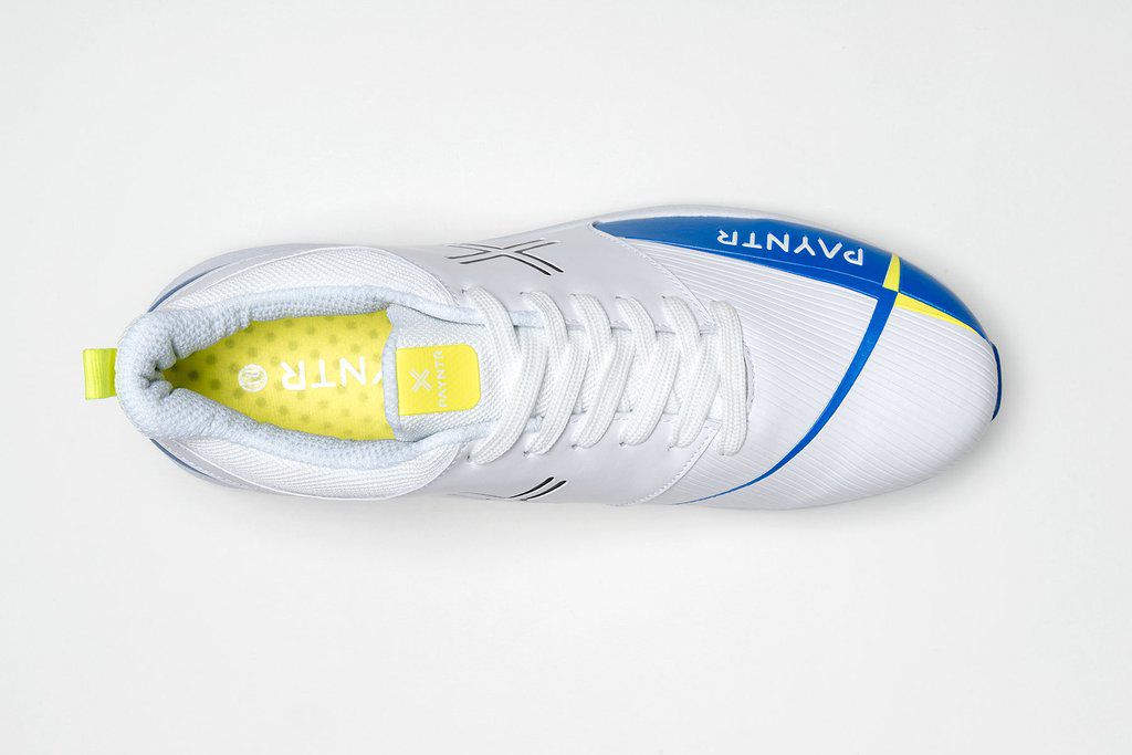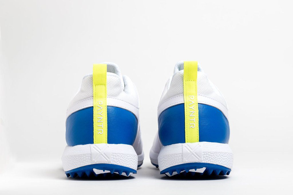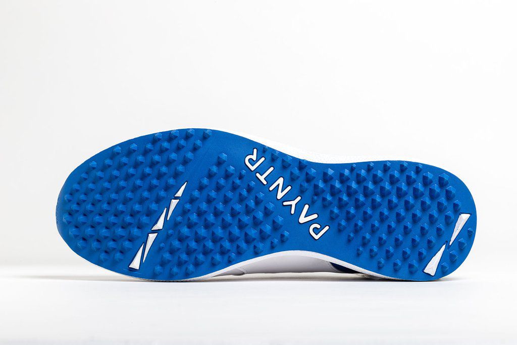 Innovate your game with our new to market PAYNTR V Pimple in White & Blue. Offering a high-performance shoe, at an affordable price. Provides responsive padding around the ankle and neckline to ensure comfort, protection and support. The honeycomb insole gives cushioning to the arch of the foot, whilst the PAYNTR side cage and PU upper allow for lasting durability of the shoe. Rubber sole for added traction.